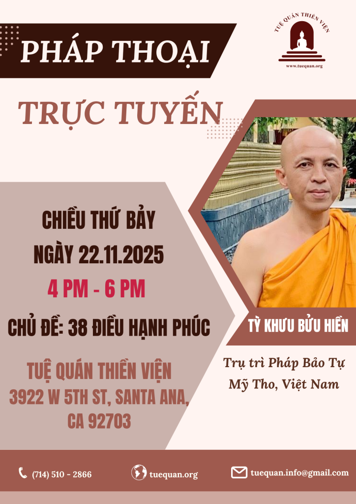 Thứ bảy, ngày 18 tháng 10 năm 2025 Thời gian: 4:00 pm – 6:00 pm Chủ đề: 38 Điều Hạnh Phúc Thượng tọa Bửu Hiền thuyết pháp trực tiếp qua zoom: https://tinyurl.com/phapthoaiSuBuuHien Kính mời quý Phật Tử đến Tuệ Quán Thiền Viện tham dự Liên hệ: tuequan.info@gmail.com 3922 W 5th St. Santa Ana, CA 92703