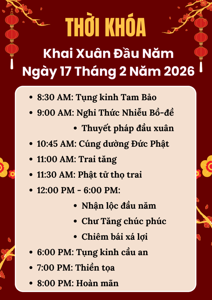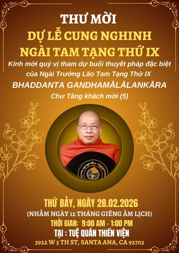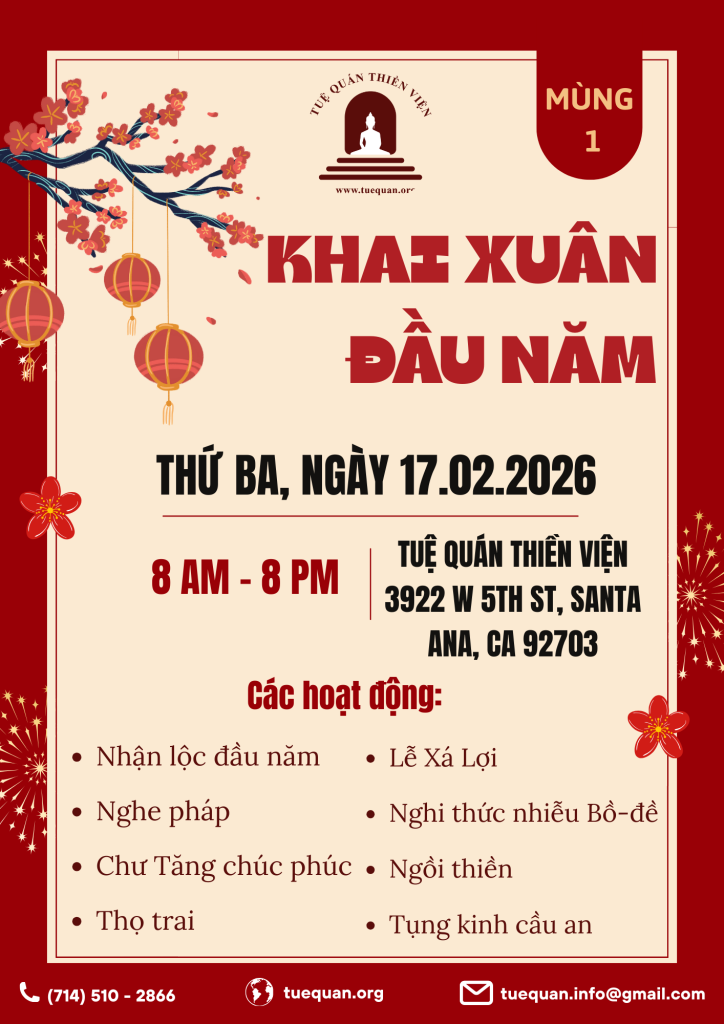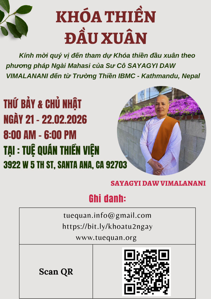 Chủ Nhật, ngày 01 tháng 02 năm 2026 Thời gian: 9:00 am – 1:00 pm TĂNG ĐOÀN ANANDA TÍCH LAN TỲ KHƯU RATHANA Mời quý Phật Tử đến Tuệ Quán Thiền Viện tham dự Liên hệ: tuequan.info@gmail.com 3922 W 5th St. Santa Ana, CA 92703