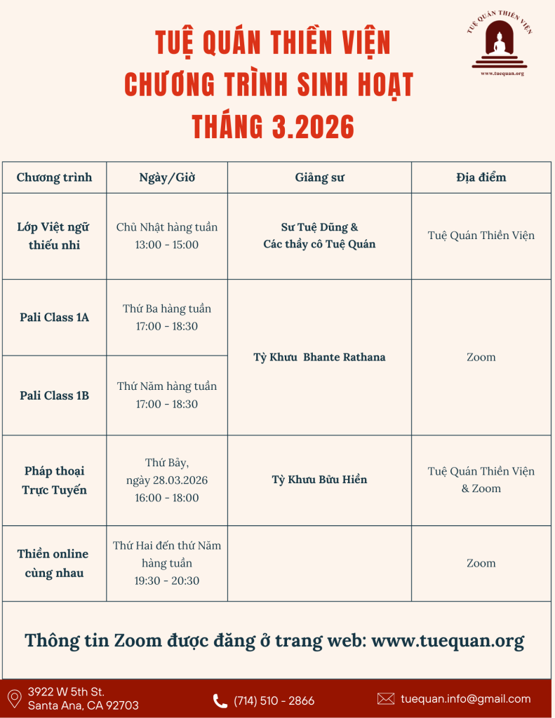 Thứ năm, ngày 26 tháng 2 năm 2026 Thời gian: 5 PM Mời quý Phật Tử đến Tuệ Quán Thiền Viện tham dự Liên hệ: tuequan.info@gmail.com 3922 W 5th St. Santa Ana, CA 92703